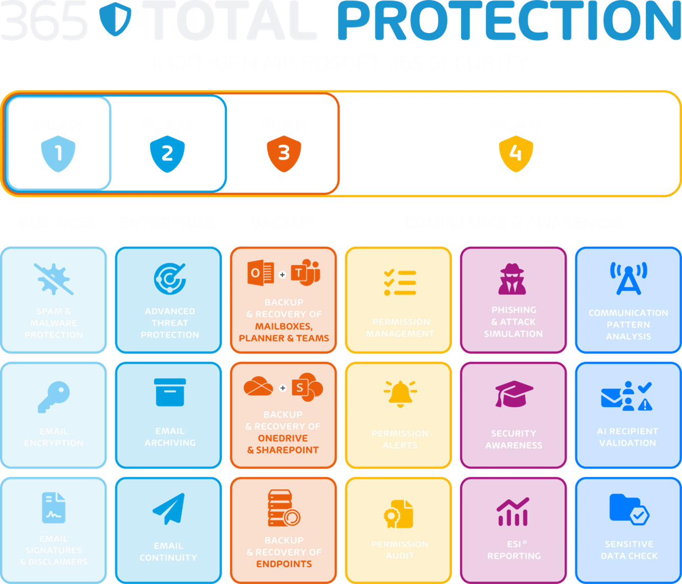 Future-proof your business operations with AI-powered M365 security, data protection, compliance & security awareness from HornetSecurity. With 4 different plans to select from, there’s an option suitable to your needs:
