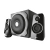 2.1 speaker set including wooden subwoofer with a total RMS power output of 60 Watt (120 Watt peak power)\n- 2.1 speaker set including wooden subwoofer with a total RMS power output of 60 Watt (120 Watt peak power)- High quality sound with deep bass\n- Convenient wired volume control with headphones and iPod/mp3 connections\n- With volume and bass control at the side\n- Smart power management: goes to stand-by when not in use