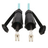 10G Duplex Multimode Cable Designed for Outdoor or Harsh Indoor Environments\nThis three-foot (one-meter) 50/125 OM3 LC/LC IP68-rated outdoor cable is ideal for connecting 10G Ethernet fiber networks in outdoor applications and other areas where protection from harsh elements is essential, such as factories, warehouses, recycling plants, machine shops and other dusty environments. The rigid, durable cable and small-form-factor LC duplex connectors withstand dust, debris and moisture that could threaten your IT infrastructure. Included dust caps are located at both ends for protection from dust and debris when the connectors are not in use.\nIP68 Rating Denotes Resistance to Dust and Water\nThe fiber cable is 100% protected against dust and able to endure immersion in 1.5 meters of water for up to 60 minutes with no damage or decline in performance. Concentration of water moisture in fiber connectors will lead to glass damage and can severely disrupt or halt performance of optical cables. For applications that require IP68 protection, use the industrial cable with a N206-SB01-IND surface-mount box and an N455-BC01-IND bulkhead coupler. If only IP44 protection against splashing water from all directions is required, pair the cable with a N206-FP01-IND, N206-FP02-IND or N206-FP04-IND metal wall plate and an N455-BC01-IND bulkhead coupler.\nColor-Coded to Avoid Misidentification That Can Cause Costly Downtime\nThis fiber cable features an aqua PVC jacket with LC duplex ends. The color-coding allows easy, fast OM3 identification in a crowded rack, patch panel or workstation and helps prevent the cable from becoming inadvertently disconnected.